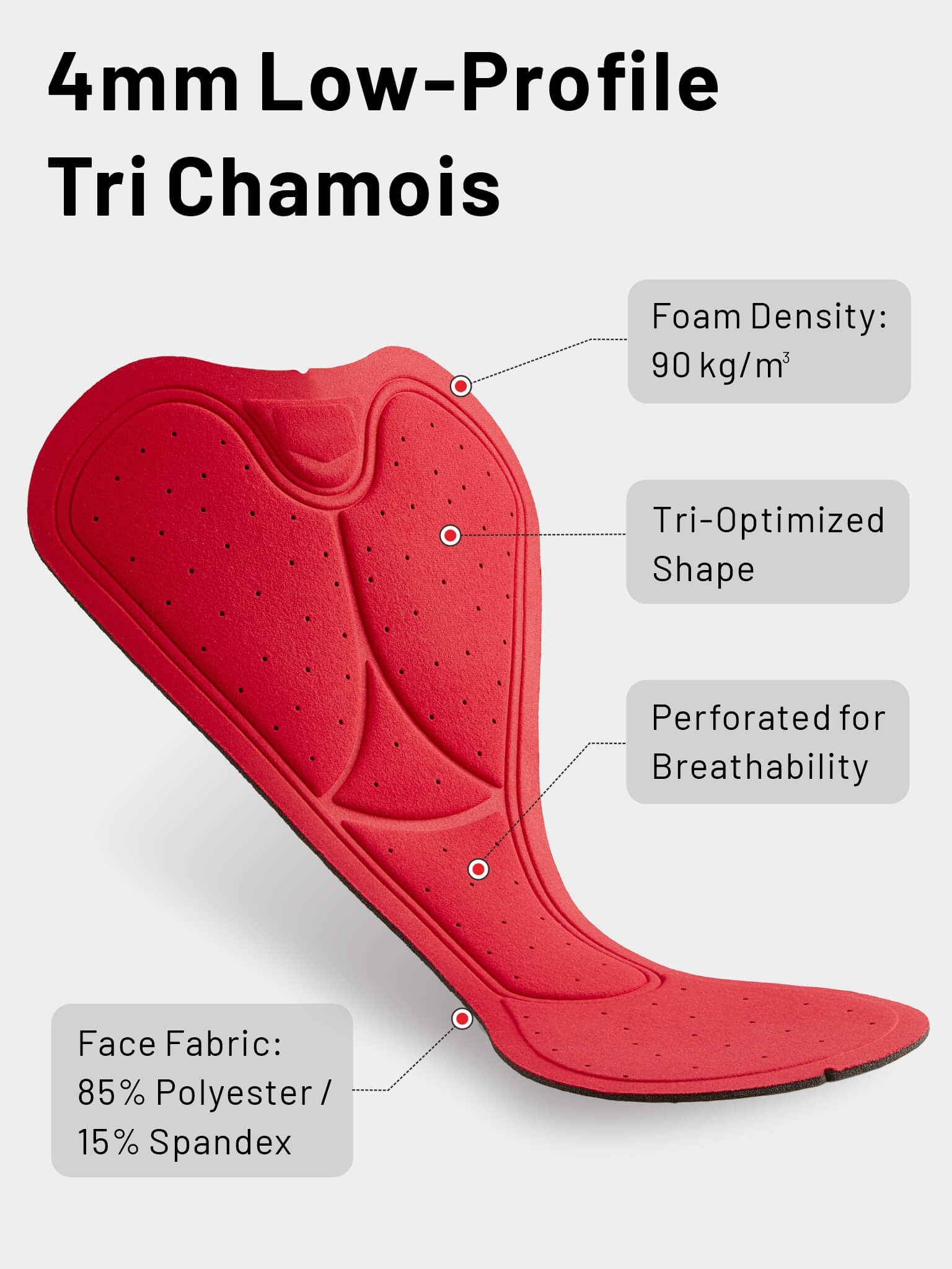The pad measures 315 × 180 mm and uses 90 kg/m³ foam with a 4 mm thickness at the sit bone area. The one-piece molded construction helps keep the pad stable and low in bulk. Compared with thicker cycling pads, this type of pad is more suitable for triathlon use, where both riding support and running freedom need to be considered.
